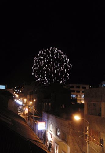 "幾つものグループによるパレード それを暖かく見守る人々 背後で次々と打ち上げられる花火 ... "