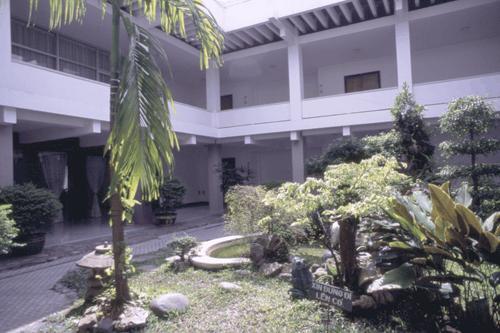 その屋上から 建物の庭や平和な街の様子を眺めていると