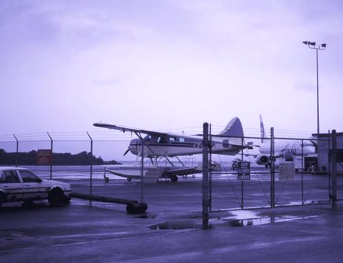 降りしきる雨の中、飛行機は Sitka 郊外の島
